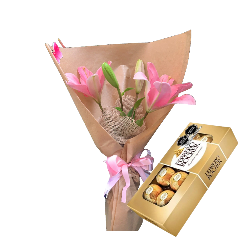 Este elegante ramalhete apresenta um galho de lírio rosa, uma flor que simboliza pureza, renovação e prosperidade. Com sua forma graciosa e fragrância delicada, o lírio rosa é perfeito para transmitir sentimentos de admiração e carinho.